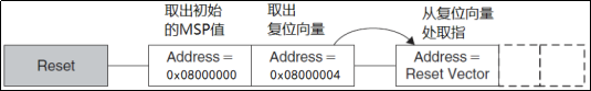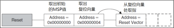 (2)从地址 0x0000 0004 处取出程序计数器指针PC 的初始值,该值指向复位后执行的第一条指令。下面用示意图表示,如图8.1.1所示: