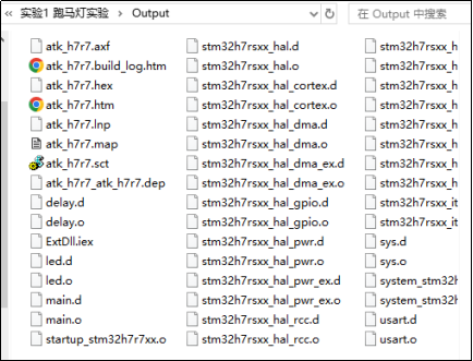 MDK 编译工程,会生成一些中间文件(如.o、.axf、.map 等),最终生成 hex 文件,以便下载到 MCU 上面执行,以STM32H7R7开发板HAL库例程的实验1 跑马灯实验为例(其他开发板类似),编译过程产生的所有文件,都存放在 Output文件夹下,如图 8.3.1.1 所示: