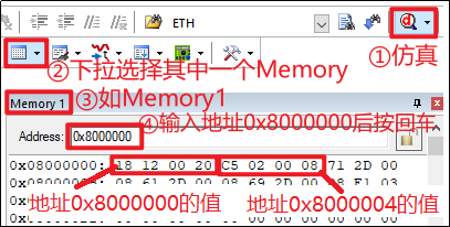 由图8.2.3.2可以知道地址0x0800 0000的值是0x2000 1218,地址0x0800 0004的值是0x0800 02C5,即堆栈指针 SP =0x2000 1218,程序计数器指针PC =0x0x0800 02C5(即复位中断服务程序Reset_Handler的入口地址),即。因为CM7核是小端模式,所以倒着读。