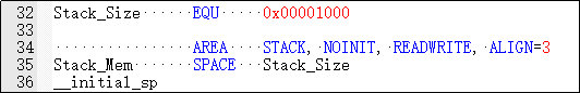 源码含义:开辟一段大小为0x0000 1000(4KB)的栈空间,段名为STACK,NOINIT 表示不初始化; READWRITE 表示可读可写;ALIGN=3,表示按照 2^3对齐,即 8 字节对齐。