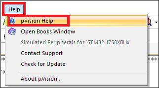 上表,列举了STM32启动文件的一些汇编和编译器指令,关于其他更多的ARM汇编指令,我们可以通过MDK的索引搜索工具中搜索找到。打开索引搜索工具的方法:MDK->Help->uVision Help,如图8.2.1.1所示: