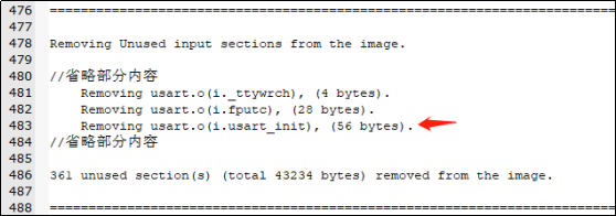 上图中,列出了所有被移除的程序段,比如 usart.c 里面的 usart_init 函数就被移除了,因为该例程没用到 usart_init 函数。