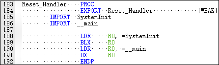 EXPORT声明复位中断向量Reset_Handler为全局属性,这样外部文件就可以调用此复位中断服务。