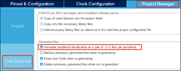 打开Project Manager-> Code Generator选项,Generated files 生成文件选项,勾选Generate peripheral initialization as a pair of ‘.c/.h’files per peripheral,勾选这个选项的话将会将每个外设单独分开成一组.c、.h文件,使得代码结构更加的清晰,如图9.3.3.16所示: