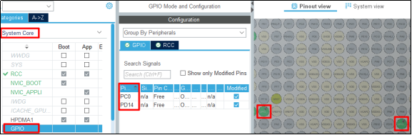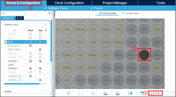 本小节,我们讲解怎么使用STM32CubeMX工具配置STM32H7RS的GPIO口。STM32H7R7开发板的PD14和PC0引脚分别连接一个LED灯,我们来学习配置这两个IO口的相关参数。这里我们回到STM32CubeMX的Pinout&Configuration选项,在搜索栏输入PD14后回车,可以在引脚图中显示位置,如下图9.3.3.10所示: