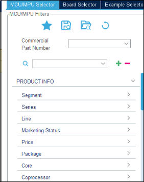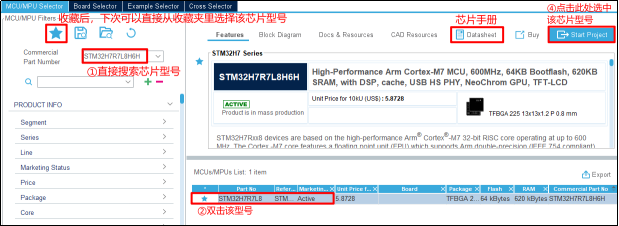 ① 直观的选择MCU型号,可指定系列、封装、外设数量等条件