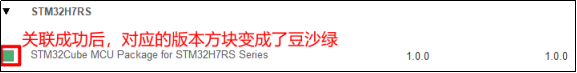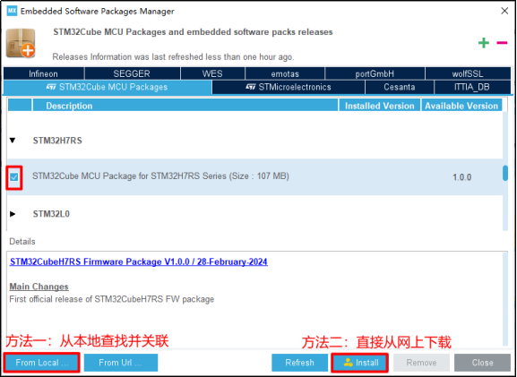 然后弹出管理界面,在该窗口找到STM32H7RS列表选项,勾选1.0.0版本。关联STM32Cube固件包有两个方法,如图9.3.2.2所示: