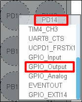 接下来,我们在图9.3.3.11引脚图中点击PD14,在弹出的下拉菜单中,选择IO口的功能为GPIO_Output。操作方法如下图9.3.3.11所示:
