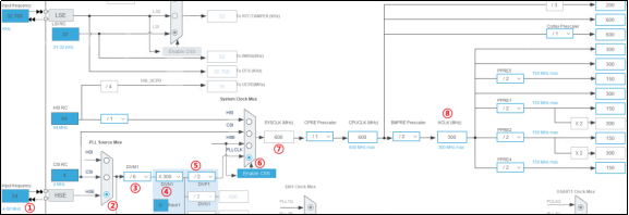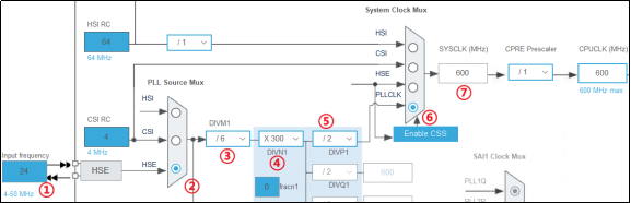 我们把系统时钟配置分为七个步骤,分别用标号①~⑦表示,详细过程为: