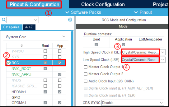 进入工程主设计界面后,首先设置时钟源HSE和LSE。如图9.3.3.6所示: