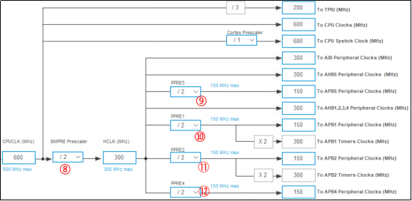 AHB1,2,3,4,5、APB1、APB2、APB4和APB5总线时钟以及Systick时钟的最终来源都是系统时钟SYSCLK。其中AHB总线时钟HCLK是由SYSCLK经过AHB预分频器之后的来,如果我们要设置HCLK为300MHz(最大也就300Mhz),那么我们只需要配置图中标号⑧的地方为2即可。得到HCLK之后,接下来我们将在图标号⑨~⑫处同样的方法依次配置APB5、APB1、APB2和APB4分频系数分别为2,2、2和2即可。注意!systick固定为600MHz,配置完成之后,那么HCLK=300MHZ,Systic=600MHz,PPRE5=PPRE1=PPRE2=PPRE4=150MHz,这和我们使用sys_stm32_clock_init函数配置的时钟是一样的。