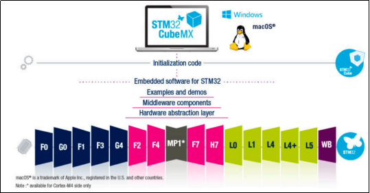 这里特别说明一下STM32CubeMX和STM32Cube固件库的关系,STM32CubeMX图形工具配置生成的代码,是基于STM32Cube固件库的,并且可以在图形工具中直接下载STM32Cube固件库。也就是说,我们使用STM32CubeMX配置出来的初始化代码,兼容STM32Cube库,例如硬件抽象层代码就是使用的STM32的HAL库。不同系列的STM32芯片,会有不同系列的STM32Cube库,而STM32CubeMX图形工具只有一个,所以开发不同的STM32系列芯片,选择不同系列的STM32Cube库即可,它们的关系如下图所示: