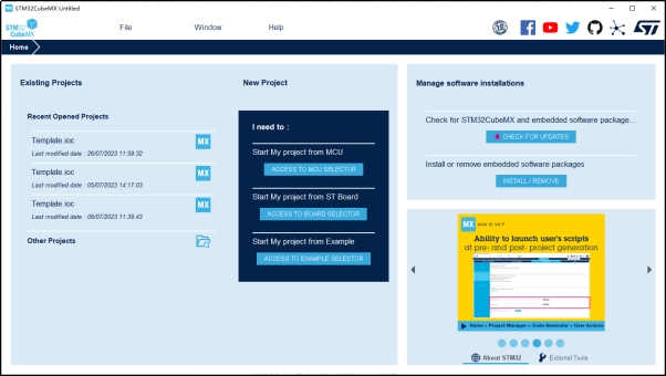 为了方便,新建工程前,我们先来下载和关联STM32Cube固件包,点击Help->Manage embedded software packages,如图9.3.2.1所示: