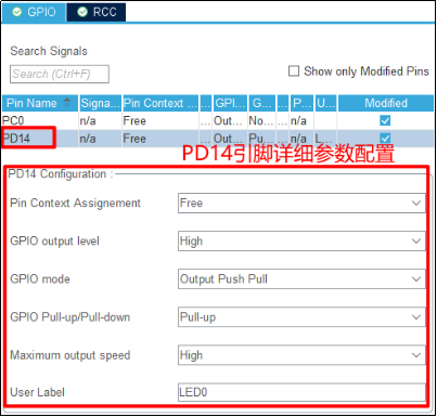 我们先配置PD14,PC0配置方法一样的。点击图9.3.3.12的中间框里面的PD14,配置如图9.3.3.13所示: