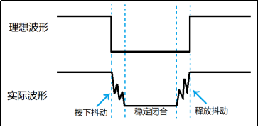几乎每个开发板都会板载有独立按键,因为按键用处很多。常态下,独立按键是断开的,按下的时候才闭合。每个独立按键会单独占用一个IO口,通过IO口的高低电平判断按键的状态。但是按键在闭合和断开的时候,都存在抖动现象,即按键在闭合时不会马上就稳定的连接,断开时也不会马上断开。这是机械触点,无法避免。独立按键抖动波形图如下: