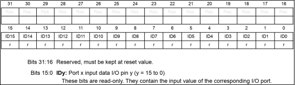 该寄存器低16位有效,分别对应每一组GPIO的16个引脚。当CPU访问该寄存器,如果对应的某位为0(IDRy=0),则说明该IO口输入的是低电平,如果是1(IDRy=1),则表示输入的是高电平,y=0~15。