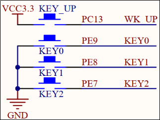 由硬件设计小节,我们知道KEY0、KEY1、KEY2和KEY_UP分别来连接到PE9、PE8、PE7和PC13上,我们做了下面的引脚定义: