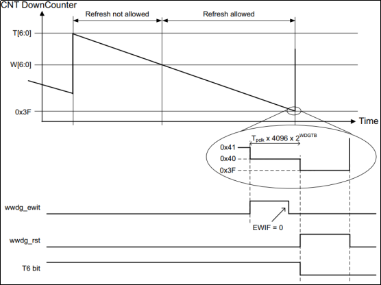 图18.1.1.2可以看出,递减计数器的值递减过程中,当T[6:0]>W[6:0]是不允许刷新T[6:0]的值,即不允许喂狗,否则会产生复位。只有在W[6:0]