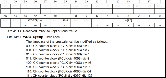 Twwdg=(4096×2^WDGTB[2:0]×(T[5:0]+1)) /Fppre1