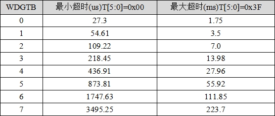 该寄存器只有低八位有效,其中T[6:0]用来存储看门狗的计数器的值,随时更新的,每隔(4096×2^ WDGTB[2:0])PCLK个周期减1。当该计数器的值从0X40变为0X3F的时候,将产生看门狗复位。