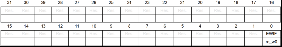 该寄存器用来记录当前是否有提前唤醒的标志。该寄存器仅有位0有效,其他都是保留位。当计数器值达到0x40时,此位由硬件置1。它必须通过软件写0来清除。对此位写1无效。即使中断未被使能,在计数器的值达到0X40的时候,此位也会被置1。 状态寄存器描述如图18.1.2.3所示: