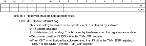 该寄存器位0(UIF)是中断更新的标志位,当发生中断时由硬件置1,然后就会执行中断服务函数,需要软件去清零,所以我们必须在中断服务函数里把该位清零。如果中断到来后,不把该位清零,那么系统就会一直进入中断服务函数,这显然不是我们想要的。