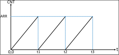 如图19.1.3.1所示,CNT计数器从0开始计数,当CNT的值和ARR相等时(t1),产生一个更新中断,然后CNT复位(清零),然后继续递增计数,依次循环。图中的t1、t2、t3就是定时器更新中断产生的时刻。