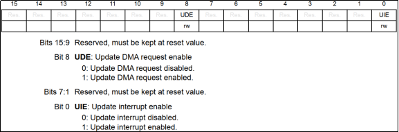 TIM6/TIM7的DMA/中断使能寄存器描述如图19.1.2.2所示: