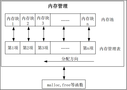 从上图可以看出,分块式内存管理由内存池和内存管理表两部分组成。内存池被等分为了n块,对应的内存管理表,大小也为n,内存管理表的每一个项对应内存池的一块内存。