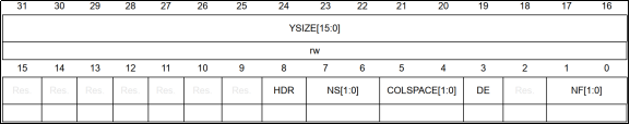 该寄存器仅高16位(YSIZE[15:0])有效,定义JPEG图片的宽度,读取该寄存器可以获得图片宽度。