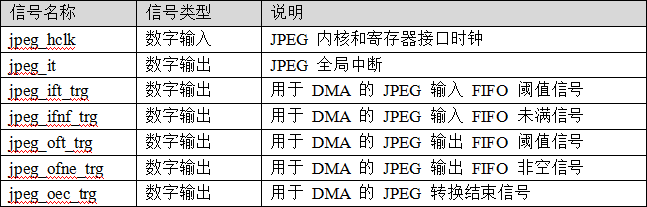图中,硬件JPEG编解码器的输入和输出数据流都是通过32位AHB总线访问,其它的JPEG内部信号如下表所示: