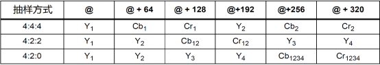 YCbCr4:2:2(YUV422)抽样,每个RGB像素占2个YCbCr字节