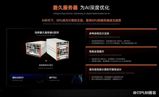 在此次发布会上,阿里云推出为AI 深度优化的磐久G系列服务器,如今GPU成为计算的主流,面向GPU的服务器成为趋势,磐久服务器能够支持多种异构芯片,同时单机提升至16颗GPU,支持最高1.5TB共享显存。通过自研核心硬件,提供最高3.2Tbps的Scale-0ut网络。而且面向高性能计算的可靠性设计。