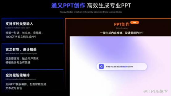 另外,通义还上线了“PPT创作”功能,能够一键生成内容准确、设计美观的PPT。用户只需要根据一句话、长文本、音视频、长文档就能智能生成PPT。而且提供了全流程智能编排的能力,可在线实时调整PPT模板编排、PPT配图智能生成、PPT文本智能改写等。