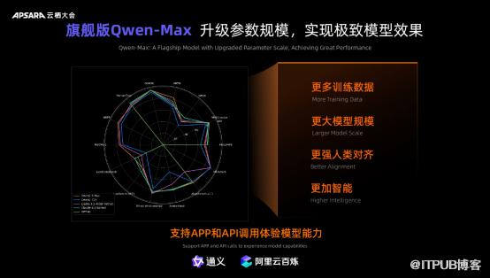 例如,此次发布会阿里云对旗舰版Qwen-Max参数规模进行了进一步升级,实现极致模型效果,训练数据更多,模型更大,从而让模型更智能,让“通义App”以及调用API的应用能够精准高效地服务金融、法律、科研、医疗、教育等领域专业人士。