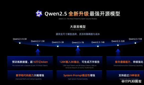 而且,Qwen2.5还提供了0.5B、1.5B、2B、14B、32B、72B等全尺寸开源,卡紧每一个生态位,它们的型号设定充分考虑了下游应用的不同场景需求,比如,0.5适合极致低功耗场景,比如耳机、鼠标等;3B是适配手机等端侧设备的黄金尺寸;32B是最受开发者期待的“性价比之王”,可在性能和功耗之间获得最佳平衡;72B是开源旗舰版本,适配企业级和科研级的应用场景。