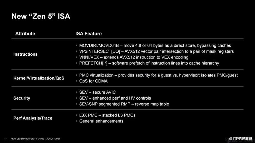 指令新增加的不算很多,AVX-512仍是重点,包括拓展至VEX编码的VNNI/VEX、矢量配对为一对掩码寄存器的VP2INTERSECT[DQ];另外就是PMC虚拟化,可为客户机提供更好的安全保障,以及异构拓扑,显然是为Zen 5、Zen 5c的组合准备的。