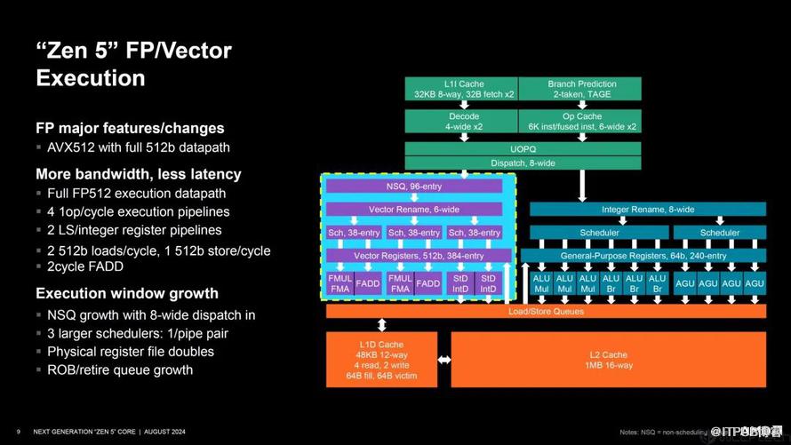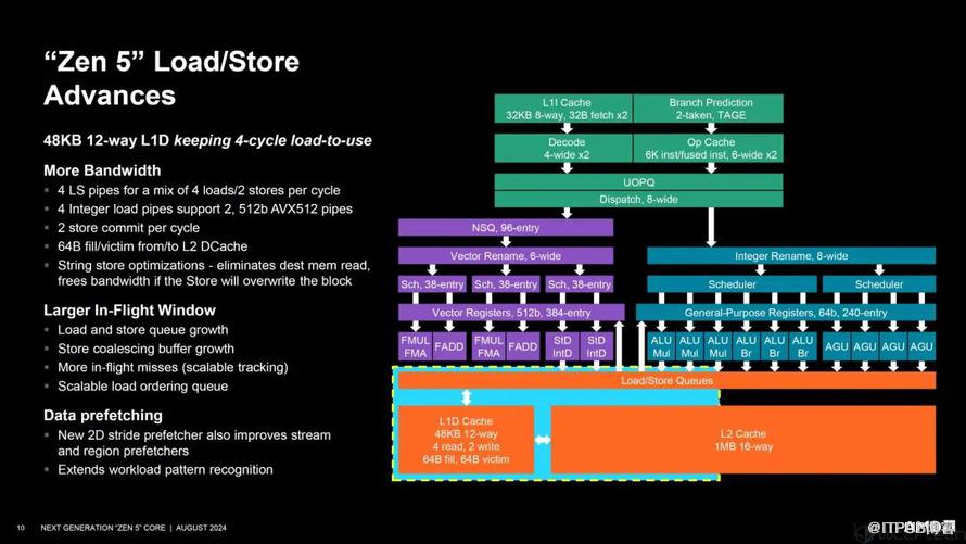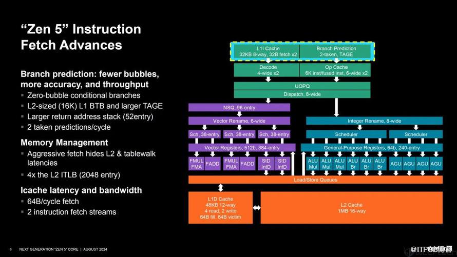 同时,在分支预测方面,AMD Zen 5也做了极大提升,吞吐量更大,精度更高,延迟更低,而且指令缓存的延迟和带宽同样得到了提升,就像是水渠也更宽敞了,面对更多的水流不会出现溢出情况。