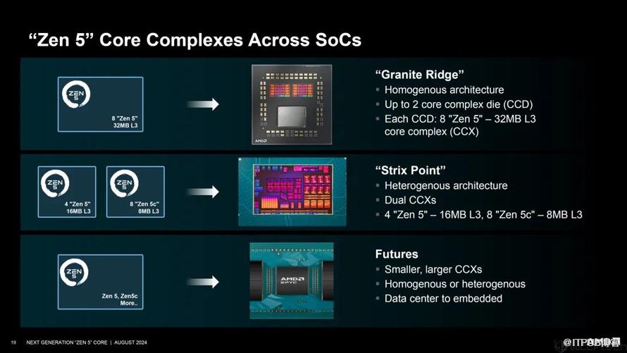 桌面上,经典chiplet设计,一个或两个CCD(等同于CCX),外加完全延续上代设计的IOD,架构上是纯粹的Zen 5,不会用Zen 5c;笔记本上,继续单芯片,双CCX组合成一个CCD。全部是Zen 5、Zen 5c的组合,最多分别4个、8个;服务器上(包括嵌入式),设计更加灵活,CCX有的更大有的更小,Zen 5、Zen 5c都会有,但应该会和Zen 4、Zen 4c一样发展各自的产品线,不会混合使用。