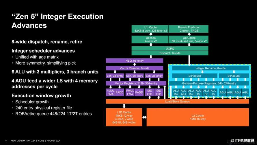 接下来是整数单元本,这也是Zen架构的强项,现在更加“膨胀”,分派、重命名、引退达到了8个宽度;ALU整数逻辑单元从4个增加到6个,包括3个乘法单元和3个分支单元,ALU调度器也从24个大幅增加到88个。