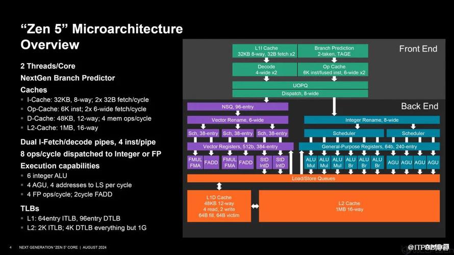首先我们来看下Zen 5的微架构总览,从前端到后端,从整数到浮点,从缓存到带宽,AMD都进行了全面升级,下面我们一一来讲述。