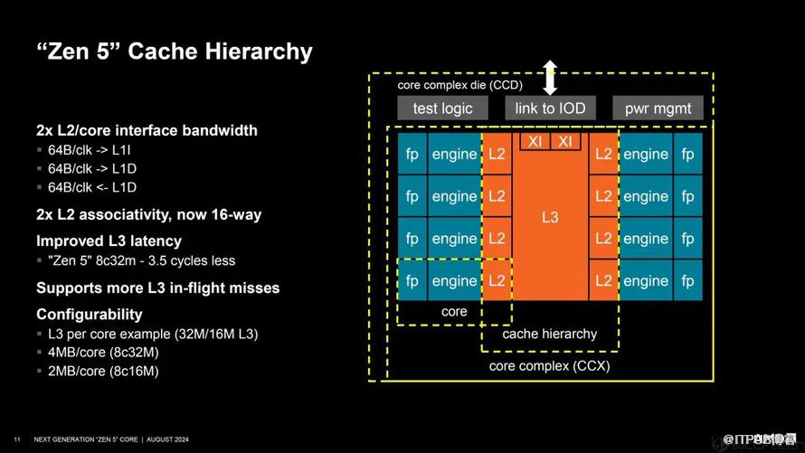 上面是Zen 5 CCX模块的核心与缓存体系结构图。另外,操作缓存(Op-Cache)如今能够支持6个指令,每时钟周期支持两组6个宽度的拾取。另外,就是二级缓存容量还是1MB,16路关联,这个变化不大。