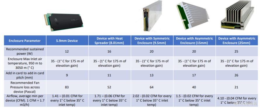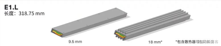 按照厚度和可配置的运行功率不同,E1.S共分为5个版本,对于20W以下的卡,可以使用9.5mm厚度的对称外壳/散热片;对于更高功率的应用,则设计了一个不对称的散热器,厚度达到25mm,并允许25W。9.5mm的对称外壳对于大多数SSD用例来说是足够的;25mm非对称外壳+散热器更适合于非固态硬盘设备;对于更注重高性能的应用场景,15mm和25mm厚度的E1.S是更为理想的选择。