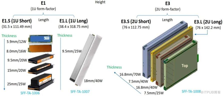 目前,EDSFF分为E1和E3两大系列,每个系列又都分为Short和Long两个版本,并按照不同的厚度和散热配置划分出不同型号,汇总如下:EDSFF提供了一系列企业和数据中心固态硬盘外形尺寸标准,以最大程度适配1U/2U服务器,概览如下: