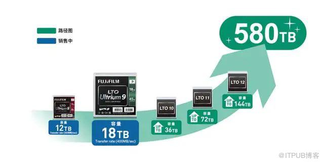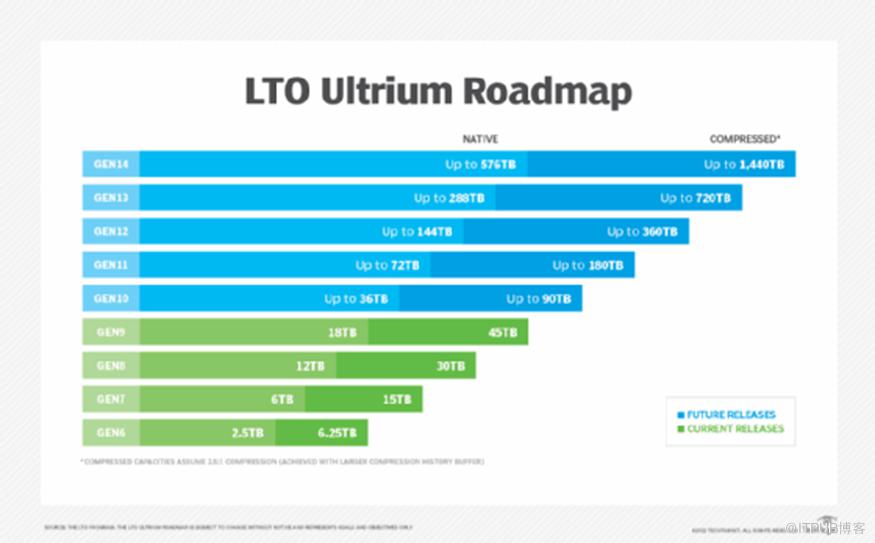 LTO ultrum路线图图形显示当前和未来发布的存储容量。