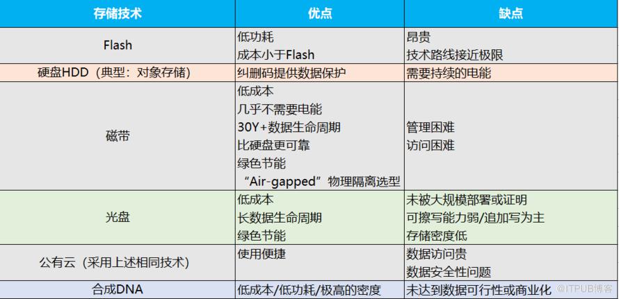 越来越多的企业需要探索冷存储方法。而需要长期保留这些数据的企业面临着一个关键问题,到底是将数据存放在昂贵、更快速的存储基础架构中实时取用,还是存放在性价比更高的冷存储层中,在以后需要时再重新访问?目前市场上存储技术主要有闪存、磁盘、磁带、光盘、公有云和合成DNA。我们来看下他们的优缺点。