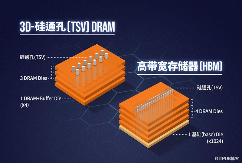 在最初, HBM是通过硅通孔(Through Silicon Via, 简称"TSV")技术进行芯片堆叠,以增加吞吐量并克服单一封装内带宽的限制,将数个DRAM裸片像摩天大厦中的楼层一样垂直堆叠,裸片之间用TVS技术连接。