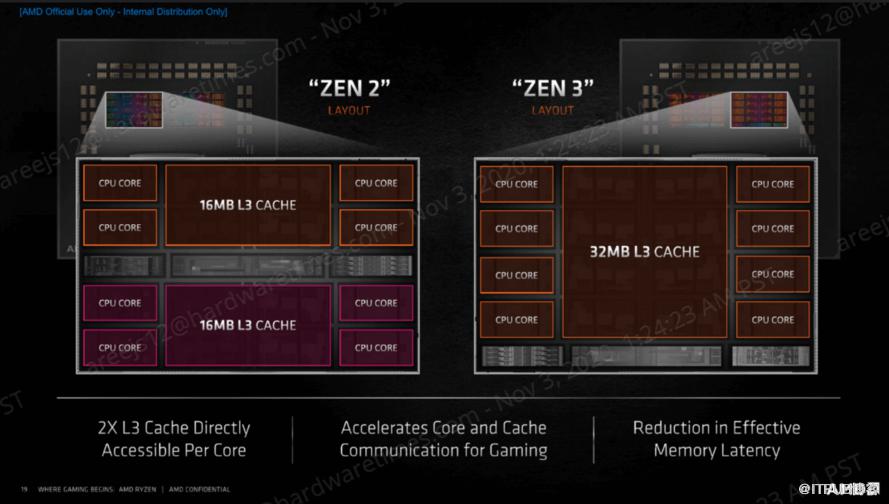 Ryzen 5000 cpu更进一步,取消了四个核心CCX,取而代之的是八个核心综合体,每个核心直接连接到CCX/CCD上的其他核心。这改善了核间延迟、缓存延迟和带宽,并为每个核提供了两倍的L3缓存,显著提高了游戏性能。
