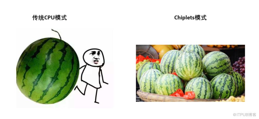 为了方便更好的理解Chiplets,我们将CPU比喻成一个西瓜。为了满足用户越来越高的需求,传统的方式是通过方法让西瓜长的越来越大。但当西瓜足够大的时候,你很难再让西瓜继续长大,同时还增加了西瓜可能坏掉的风险。Chiplets的方式则是提供两个、四个小西瓜来满足用户的对越来越大的需求。
