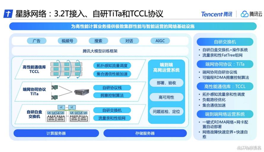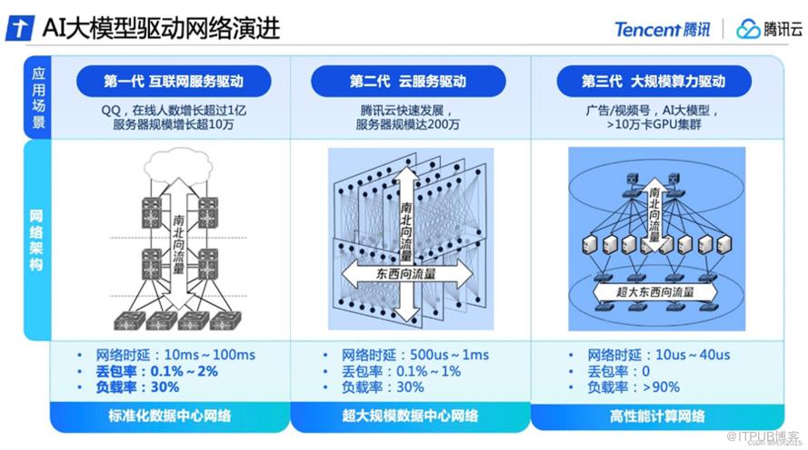 在数据中心,网络就像连通各地的公路,承担着数据的传输作用。网络的能力直接决定着数据中心的算力,尤其是随着AIGC时代的到来,人们对算力的需求越来越大,网络的升级改造也成为每个数据中心关注的重点。谈到数据中心应对网络压力,没有人比腾讯更懂。今天我们就来看看腾讯云是怎么搭建这张网的。在近日北京国家会议中心举办的ODCC大会上,来自腾讯的技术专家分享了腾讯云数据中心网络的发展过程。事实上,从传统的计算网络到如今的高性能网络,腾讯的数据中心改造升级都是由关键的技术革新所驱动的。分阶段来看,腾讯数据中心网络技术共经历了三代架构的三大阶段。一、互联网服务驱动:腾讯最早靠QQ起家,在2006年的时候,腾讯的服务器总量低于一万台,那时腾讯网络架构基本上是通过商业设备和人工运维连接及打通整个网络,主要依靠人工方式运维。然而到2010年的时候,腾讯QQ在线人数已经增长超过1亿,服务器规模更是增长超10万的需求驱动,腾讯形成了由互联网服务驱动的以南北向流量为主的第一代网络架构。在这一阶段,腾讯通过与商业厂商的合作,通过商业设备以及工具支撑,快速将网络规模扩充到10万台左右,流量达到1个T,采用自动化工具进行监控,网络时延在10-100毫秒之间,丢包率为0.1%-2%,负载率达30%,网络故障处理效率基本上在15分钟完成。二、云服务驱动时期:2015年以后,腾讯云快速发展。腾讯服务器规模达到了近200万台,数据中心内部的网络流量形成规模,这时进入了腾讯云的第二代网络架构,即南北向流量和东西向流量兼顾的架构。在这一阶段,因为腾讯云上承载了很多第三方租户,第三方租户对服务质量非常敏感,一旦腾讯网络抖动将会形成对第三方业务的放大效应,甚至是灾难性影响。为了降低设备故障对网络的影响,首先就是采用多平面,降低单一设备对整个故障的影响,其次在有了多平面、设备变多后,再用大型商业路由器则成本较高,腾讯开始定制网络设备,将路由器转为定制的交换机。在这个阶段,腾讯基本上采用定制设备、多平面以及SDN进行路由器控制,网络时延降低到500纳秒到1毫秒,丢包率为0.1%-1%,负载率为30%,任何故障可在一分钟之内得到恢复。三、大规模算力驱动时期:在2019年到2020年的时候,随着腾讯云的快速发展以及用户的迅猛增加,腾讯虚拟机规模达到了千万,IPV6导致路由条目达到亿级,不论是交换机、路由器以及还是网络设计处理能力都达到瓶颈,腾讯云于是引入X86网关集群作为控制面,同时在骨干网引入了X86 NFV设备,用控制器完整地调度全网路由以及全网的配置分发和计算,腾讯也加速了网络设备的迭代及提高可运维性,主要采用白牌硬件以及开源操作系统,形成了全自主研发、可控的网络体系,这为2020年和2021年进入算力时代的网络架构变革做好了准备。在算力时代的网络架构变革到来之际,腾讯的网络系统已经从传统网络系统过渡到分布式互联网业务系统,故障实现零容忍及自愈能力,基础设施可靠性以及可运维性及能力达到了新的阶段。在今年6月份,腾讯云发布的新一代 HCC 高性能计算集群,基于星脉高性能网络打造,可以实现 3.2T 超高互联带宽,算力性能较前代提升 3 倍,为 AI 大模型训练构筑可靠的高性能网络底座。腾讯云专家表示:"如果说过去前两个阶段,我们是村村通的马路,解决大规模部署和广覆盖的问题,到了第三个阶段的星脉网络,我们解决方案就是高速公路,全自动化、无拥塞的高速公路。"腾讯云通过自研设备搭建高速公路,包括自研的交换机、光模块等,可以做到更快迭代。在硬件方面,星脉网络自研白盒交换机,这是一种软硬件解耦的开放网络设备,采用四层解耦体系,包括接入、转发、路由、管控系统;腾讯云还自研了网络操作系统,包括网络OS与网管平台,构建了互联底座,实现自动化部署和配置。在软件方面,腾讯云自研的TiTa网络协议,能够实时监测并调整网络拥塞,TiTa网络协议能够提升40%的带宽负载,还能提供低延时无损网络,实现高负载下的0丢包,使集群通信效率达90%以上。腾讯云专家将其与传统网络协议对比,称:"这是让有不同需求的人走不同的路,就不会导致堵塞了。"此外,腾讯云还为星脉网络设计了高性能集合通信库TCCL,融入定制化解决方案,使系统实现了微秒级感知网络质量。结合动态调度机制合理分配通信通道,可以避免因网络问题导致的训练中断等问题,让通信时延降低40%。腾讯云专家将其比喻为"导航系统",优化后的集合通信就像有了导航一样,可以快速找到最优路径。为确保星脉网络的高可用,腾讯云自研端到端全栈网络运营系统。它可以让大模型训练系统的整体部署时间从19天缩减至4.5天,保证基础配置100%准确;通过端网立体化监控与智能定位系统,它可以进行离线故障诊断、在线故障实时告警,让整体故障的排查时间由天级降低至分钟级;此外,它具有秒级的故障自愈能力,端侧会主动发起路径选择,能够极速恢复网络故障。在"星脉"高性能计算网络基础上,如今腾讯已经进行大模型的相关训练。以万亿参数大模型为例,在前年,100G网络训练相同数据需要50天;但在今年上半年,腾讯用七天时间就可以完成相同的训练。腾讯云专家表示,在未来,随着数据集、参数不断增加,腾讯也有计划推出星脉2.0、3.0的版本,包括GPU的互联规模、带宽、计算加速等等环节。"到下半年,我们可能